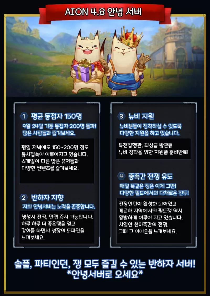 아이온 4.8버전 65만렙 안녕서버 뉴비 태동풀셋 지원 파티외적 활성화 최대 동접 200 명