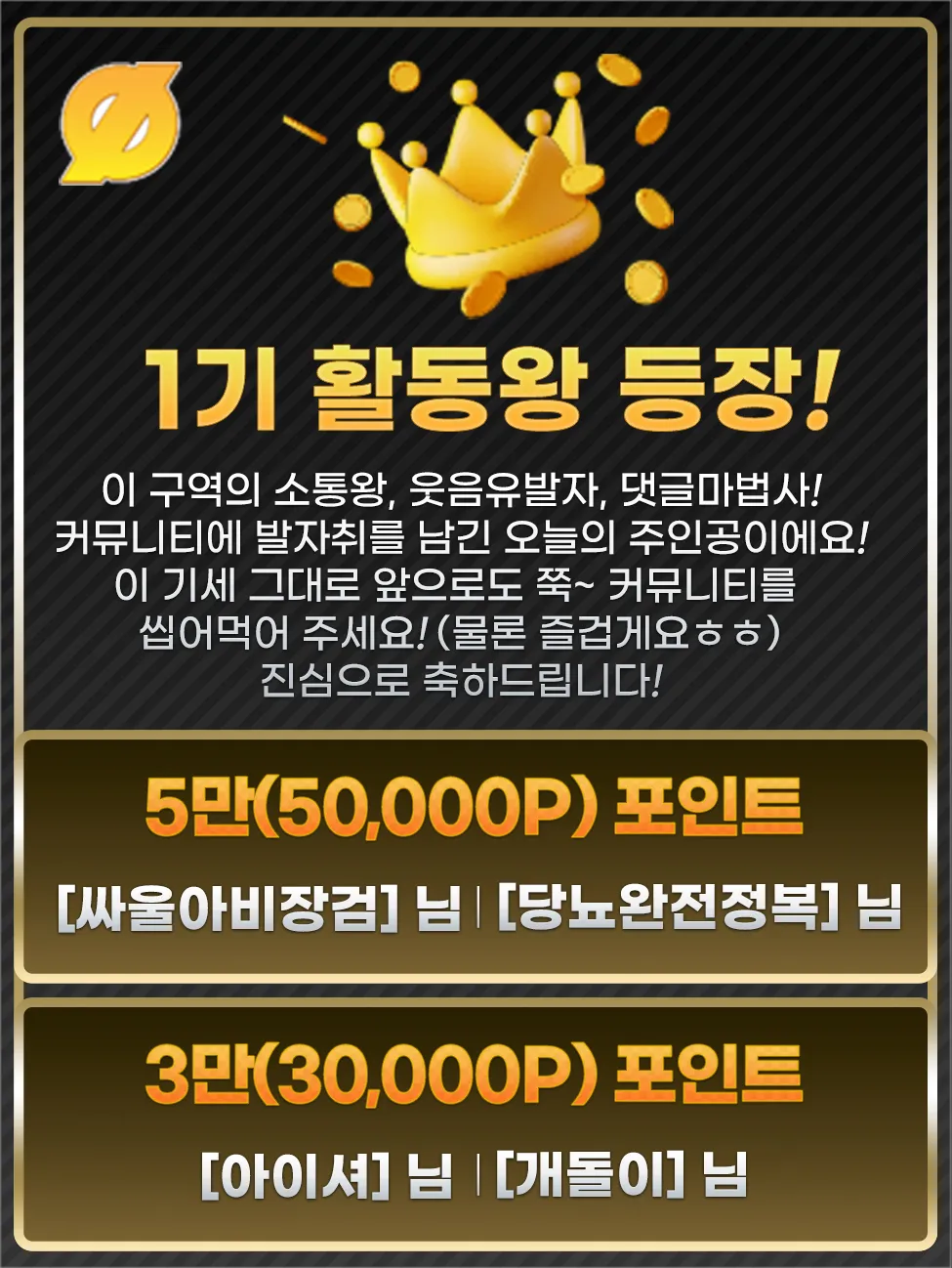 ์ฐ๋ฆฌ ์๋ฒ์ผ๋์ ์ปค๋ฎค๋ํฐ์ ์ด์ ์ ๋ถํ์ฐ๋ฉฐ ํ์ฝํด์ฃผ์ ์ด๋ฒ ๋ฌ ํ๋์!